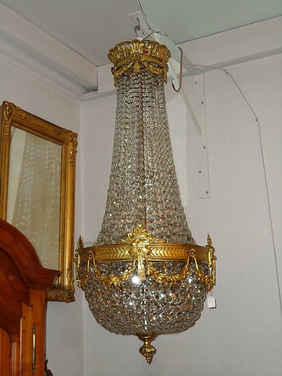 Grand lustre en forme de montgolfière, BAG Turgi, Suisse, vers 1950. Cristaux en forme d'octogones, bronzes dorés de haute qualité,